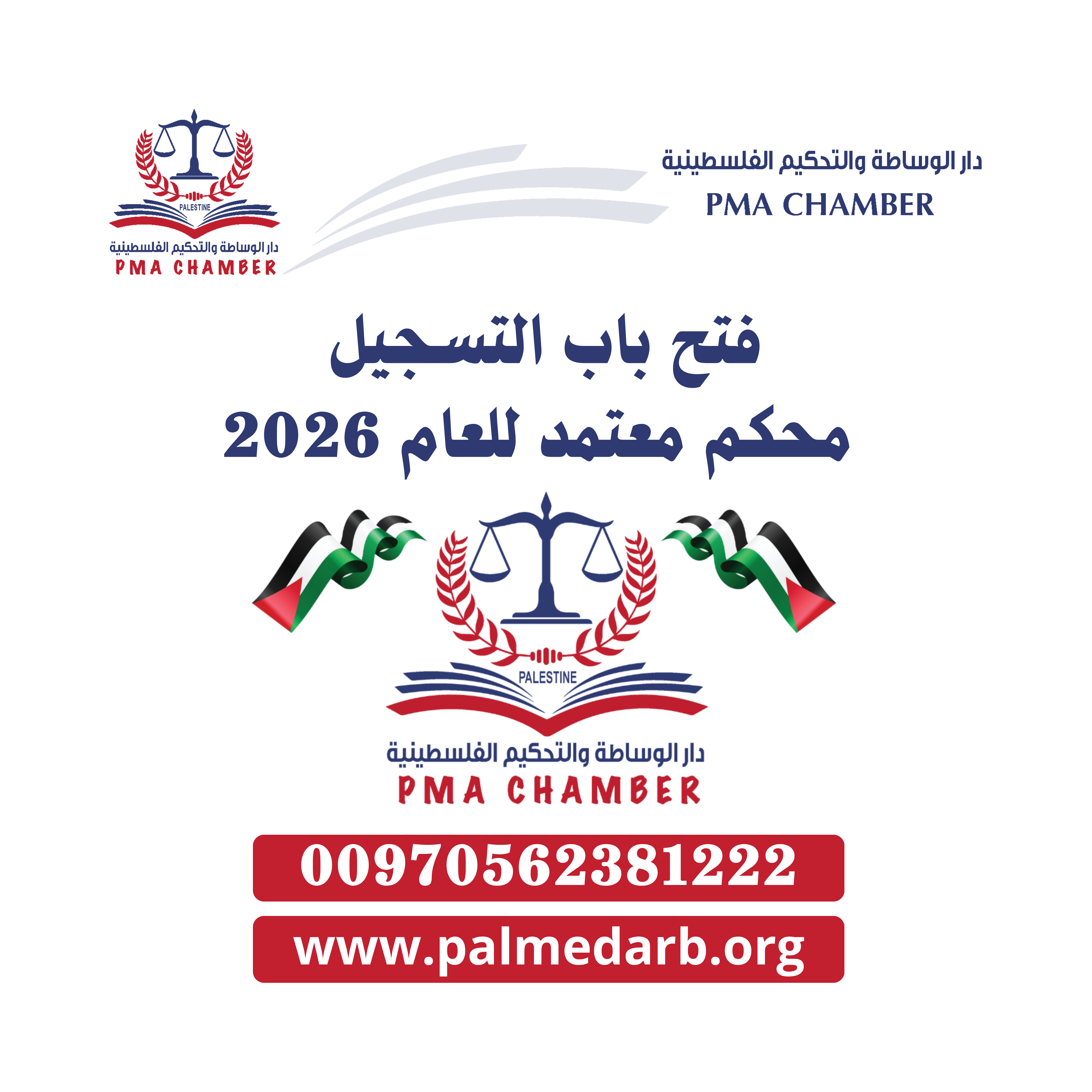 تعلن دار الوساطة والتحكيم الفلسطينية فتح باب تجديد واعتماد المحكمين لعام 2026، داعية المحكمين المعتمدين لعام 2025 وكافة الراغبين بالانضمام لاستكمال إجراءات الاعتماد، بما يشمل الإدراج الرسمي ضمن قائمة المحكمين المعتمدين والاستفادة من خصم 40% على البرامج والدورات والمزايا المهنية المتخصصة.